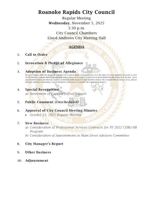 The Roanoke Rapids Regular City Council meeting will be held on Wednesday, November 5, 2025, at 5:30 p.m. in the Lloyd Andrews City Meeting Hall, 700 Jackson Street, Roanoke Rapids, NC 27870.