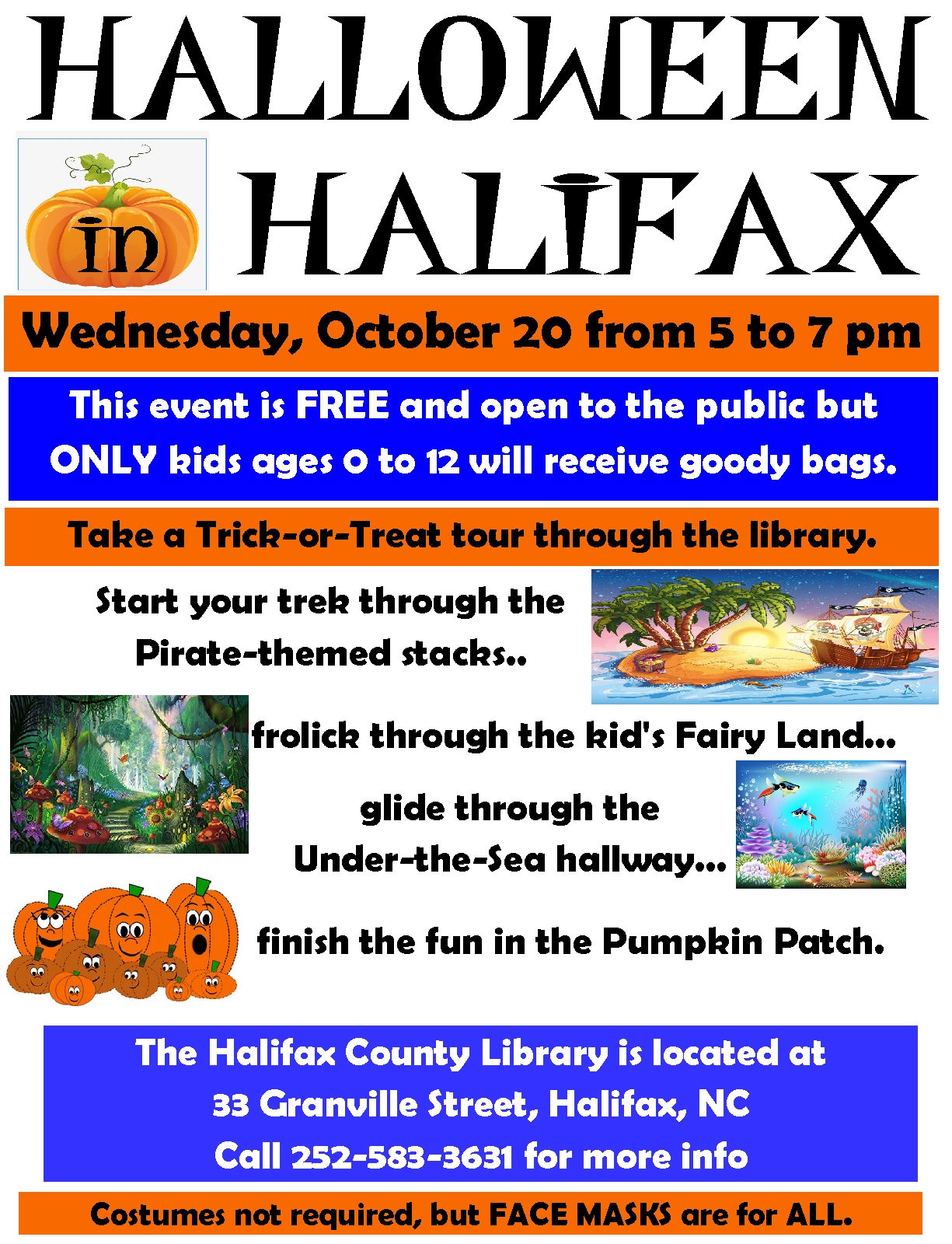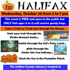 The Halifax County Library is hosting a trick-or-treat tour through the library on Wednesday, October 20 from 5 p.m. to 7 p.m.
