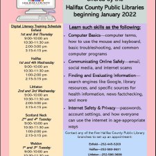 Skills included in this training will include computer basics, communicating online safely, finding and evaluating information, and internet privacy and safety. This program will be offered at all five branches of the Halifax County Library System.