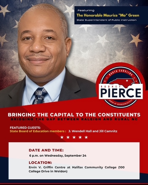 Elected last November, Green made two campaign visits in Halifax County last year — first to the Center for Energy Education in Roanoke Rapids in July, and later to the Good News Church of God in Scotland Neck in September. “His return this fall marks a continued commitment to engaging North Carolinians at the community level,” Pierce said.