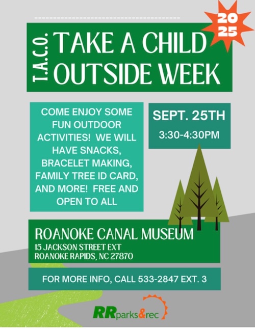 The Roanoke Rapids Parks and Recreation Department will participate in Take a Child Outside Week at the Roanoke Canal Museum on Thursday from 3:30 p.m. to 4:30 p.m.