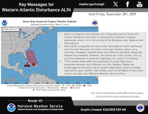 The National Weather Service said in its morning briefing it is closely monitoring the tropical disturbance over the northeast Caribbean as it could impact the southeast U.S. and Carolinas early next week.
