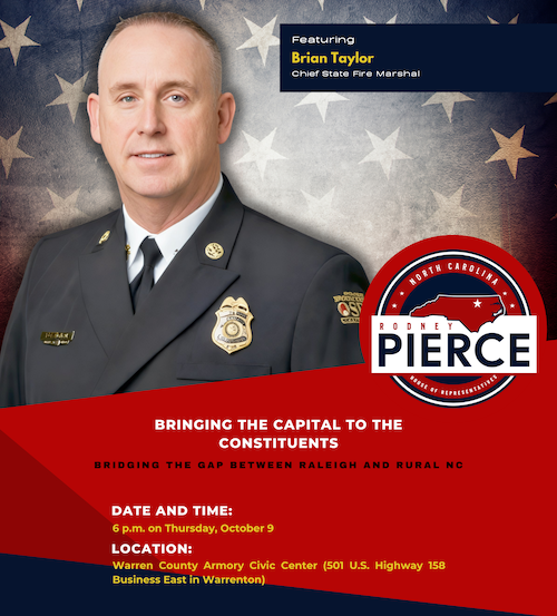 North Carolina State Fire Marshal Brian Taylor will be State Representative Rodney D. Pierce’s next guest in the legislator’s Bringing the Capital to the Constituents series.