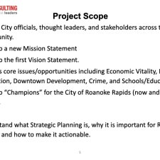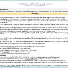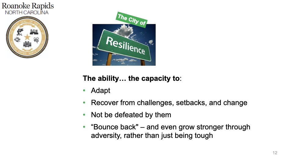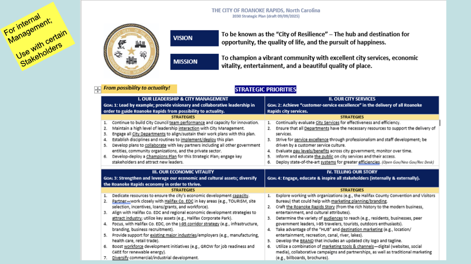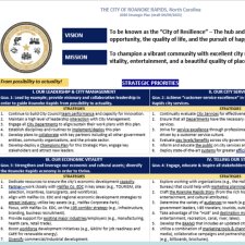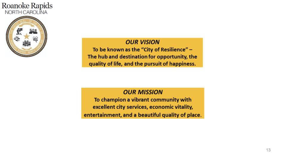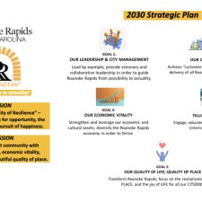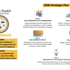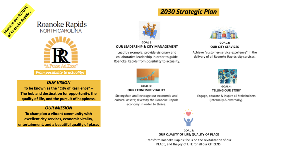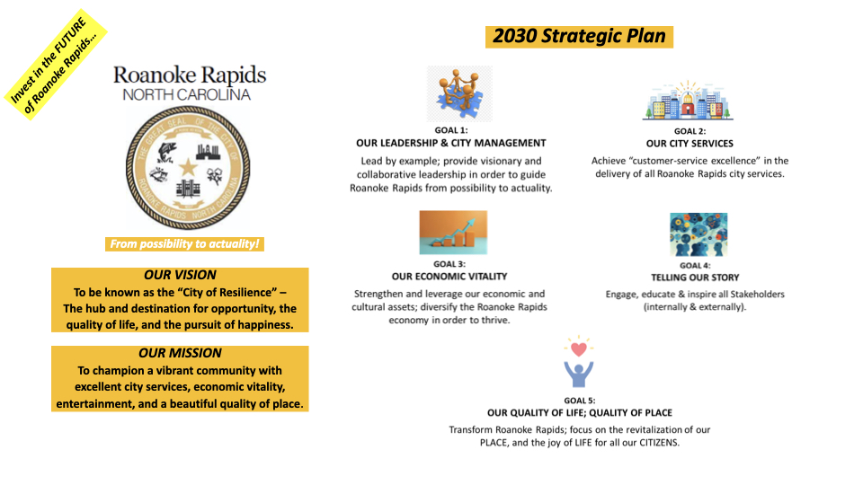 The strategic plan includes a vision statement and mission statement. The vision statement suggests Roanoke Rapids be known as the city of resilience — the hub and destination for opportunity, quality of life, and the pursuit of happiness.