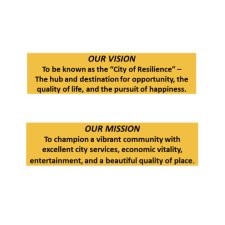The mission statement is “to champion a vibrant community with excellent city services, economic vitality, and a beautiful quality of place.”