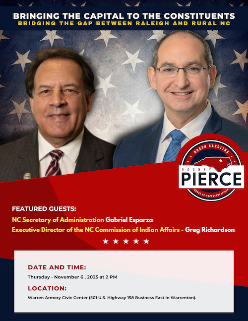 The event, scheduled for 2 p.m. on Thursday, November 6 at the Warren Armory Civic Center in Warrenton, will feature North Carolina Department of Administration Secretary Gabe Esparza and Greg Richardson, executive director of the North Carolina Commission of Indian Affairs and a member of the Haliwa-Saponi Indian Tribe.