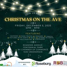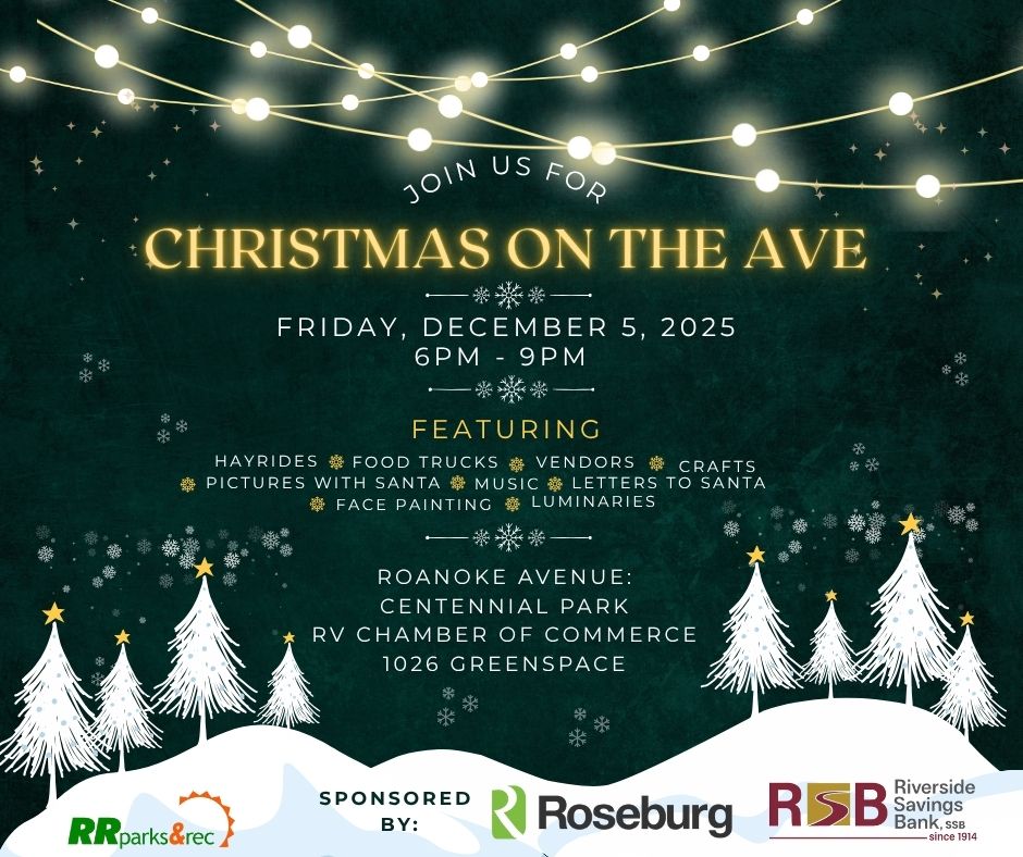 On December 5 from 6 p.m. to 9 p.m., Christmas on the Avenue kicks off the holiday season with events at Centennial Park, the Chamber of Commerce, and the 1026 Urban Greenspace on Roanoke Avenue. This event, along with the parade, is being sponsored by Riverside Savings Bank and Roseburg.