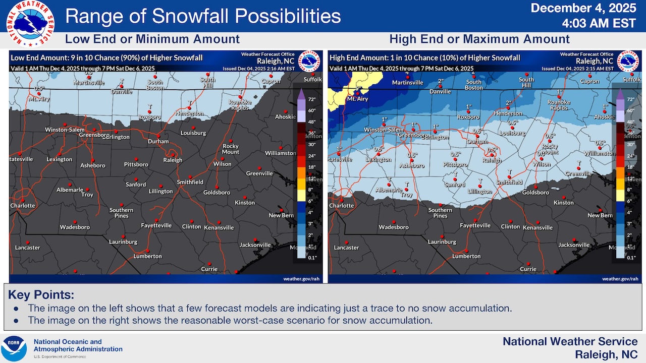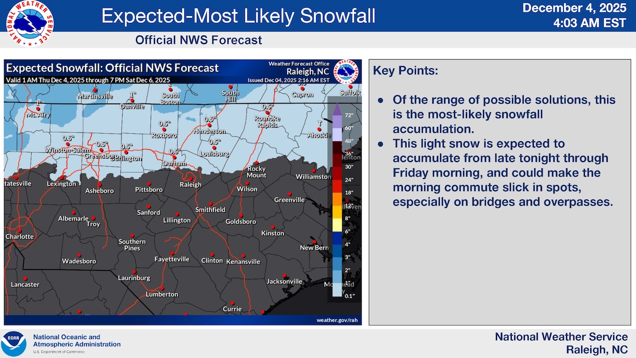 Total snowfall of up to one inch is possible, though forecasts specifically for the Roanoke Rapids area suggest approximately 0.5 inches.