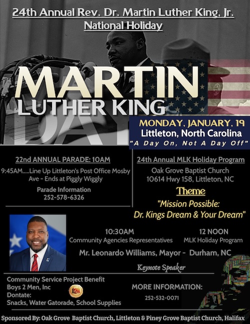 On January 19, Oak Grove Baptist Church, located at 10614 Highway 158 in Littleton, will hold its 24th King Day commemoration service in conjunction with Piney Grove Baptist Church.