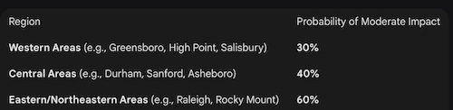 There is the probability of moderate Impacts, which include hazardous driving conditions, disruptions to daily life, and possible infrastructure closures.