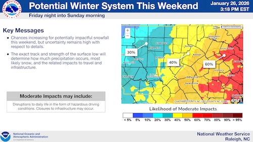 “There is still a high degree of uncertainty in the details such as snow amounts and where exactly the highest amounts occur,” the NWS Raleigh bureau said. “Forecast snow totals will not become available until Wednesday afternoon or Thursday morning.”