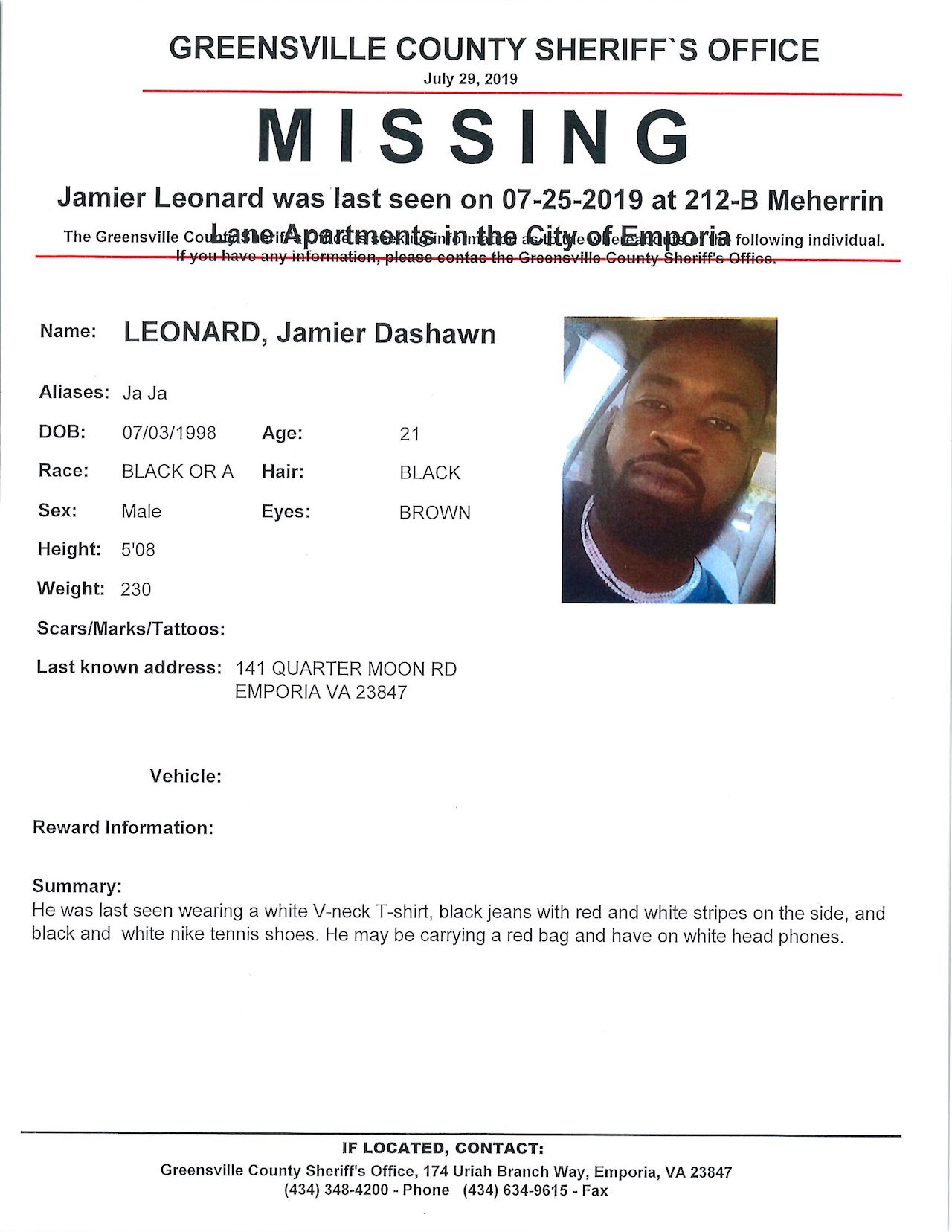 The Greensville County Sheriff's Office continues its search for Jamier Dashawn Leonard.