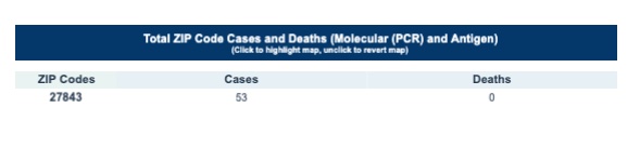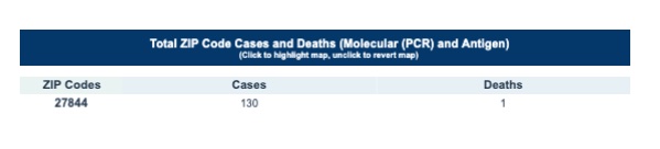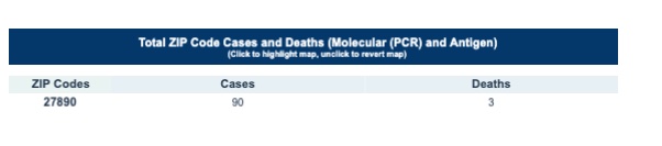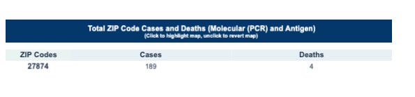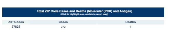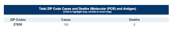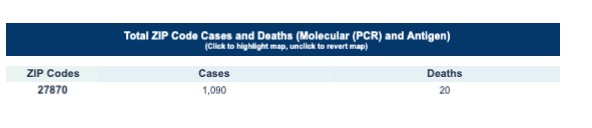 The latest death, according to the North Carolina Department of Health and Human Services COVID-19 dashboard, was reported from within the Roanoke Rapids area ZIP code and is the 20th to be reported from that area.