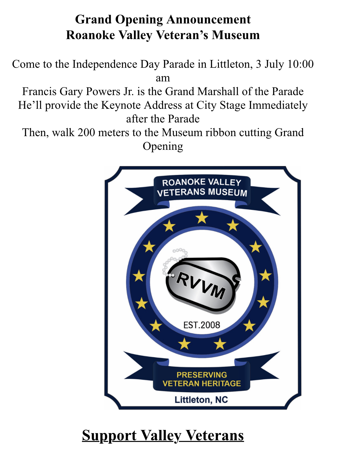 In addition to its annual parade which begins at 10 a.m. Saturday, the town will celebrate the grand opening of the relocated Roanoke Valley Veterans Museum.