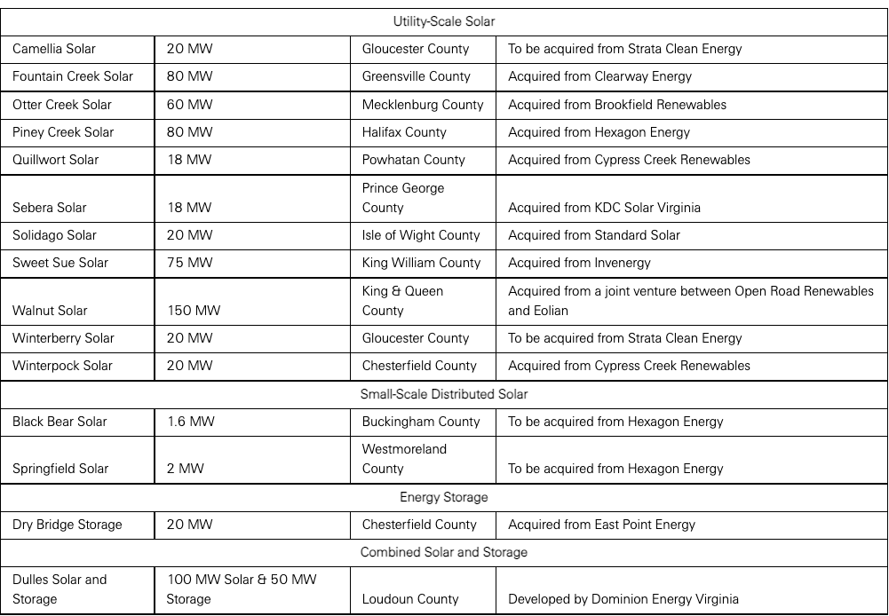 The proposal includes 11 utility-scale solar projects, two small-scale distributed solar projects, one combined solar and storage project, and one stand-alone energy storage project, which will be owned and operated by Dominion Energy Virginia.