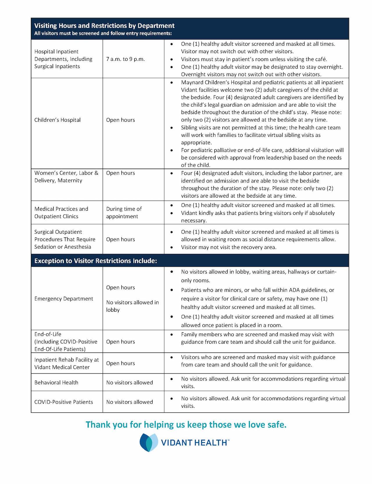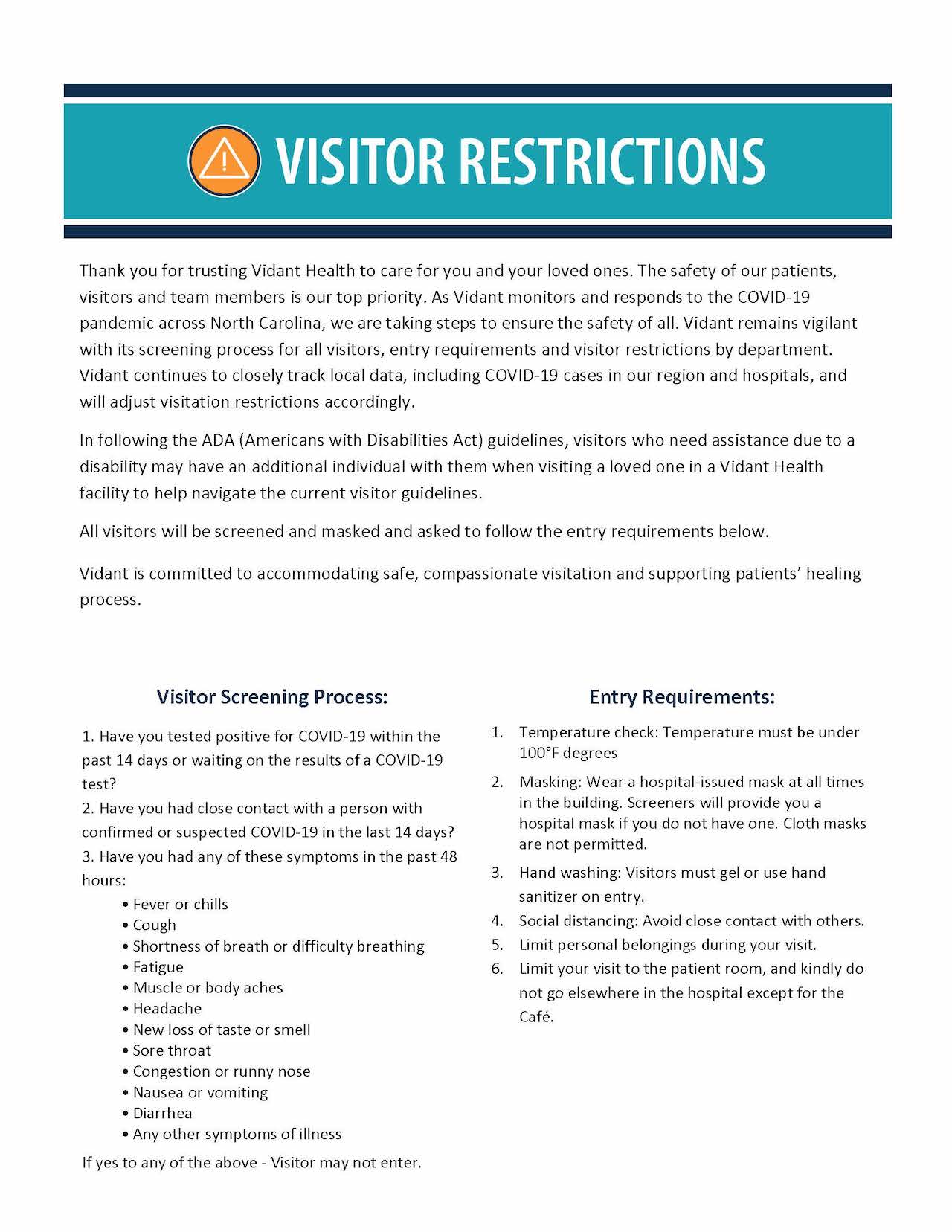 Effective 8 a.m. Thursday, Vidant will update its visitor guidelines across the system, including restricted visitation and a new requirement that all visitors wear a hospital-issued mask.