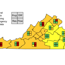 Groundwater levels for monitoring wells in the Climate Response Network have shown continued declines within the central and western portion of the Commonwealth with nine regions currently below the 25th percentile. Of these, groundwater levels within six drought monitoring regions are currently below the 5th percentile including the Big Sandy, New River, Upper James, Shenandoah, Northern Virginia, and York-James.