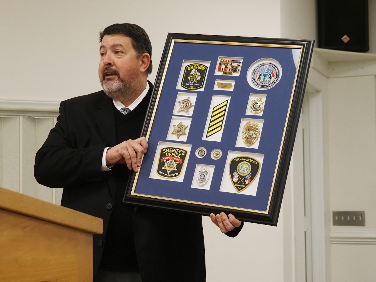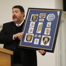 Before Guyant received the Order of the Long Leaf Pine, Phillips presented the retired chief a frame containing his badges, patches, and embroidered stripes from all the agencies he served during his career, a gift Guyant’s wife helped the department with.