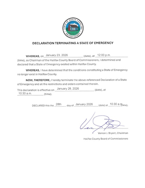 Halifax County Board of Commissioners Chairman Vernon Bryant today signed a declaration which lifts the state emergency imposed during this past weekend’s storm.