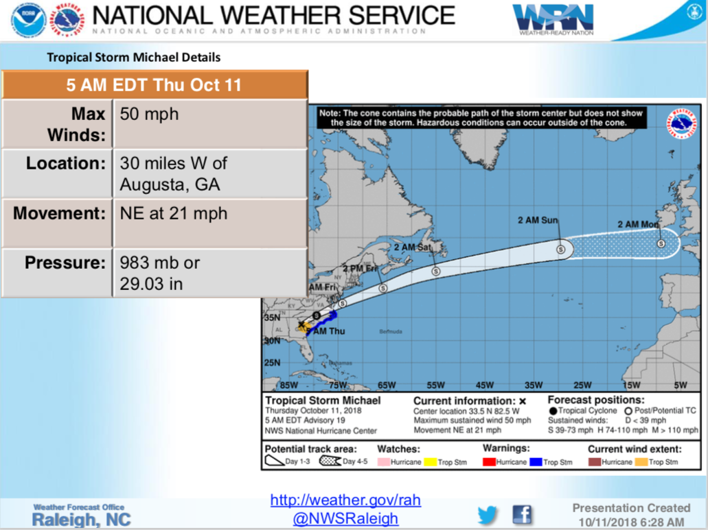 In its latest briefing this morning, the National Weather Service says Central North Carolina can expect elevated winds and the chance of flash flooding from Hurricane Michael.
