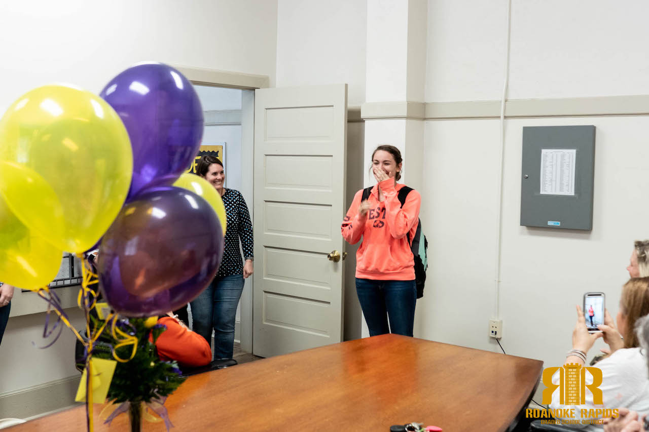 Assistant Superintendent Larry Catalano surprised Edwards with the scholarship letter today at Roanoke Rapids High School surrounded by her family.