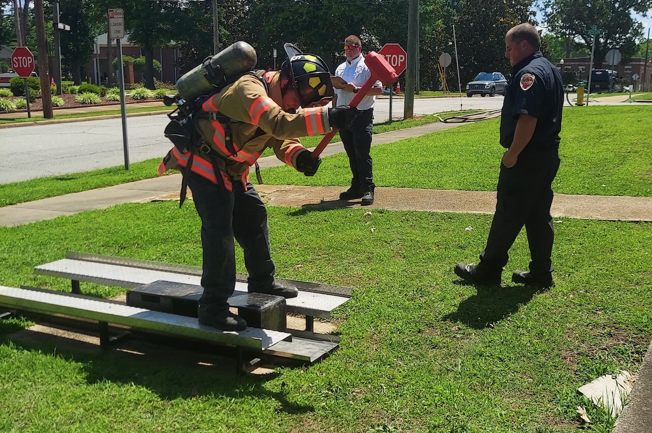 In the late spring swelter this morning, five of seven people who have applied to be part of the Roanoke Rapids Fire Department’s hiring pool went through the agility training to prove themselves worthy when a position becomes available.
