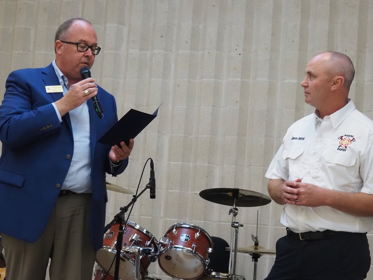 “Tonight is a special recognition opportunity for our fire chief,” the city manager said of Patrick, who is retiring on September 1. “Jason has been a tremendous team leader and very humble public servant and we just want to take a moment to say thank you. We’re going to miss you but we know your heart is with the fire department.”