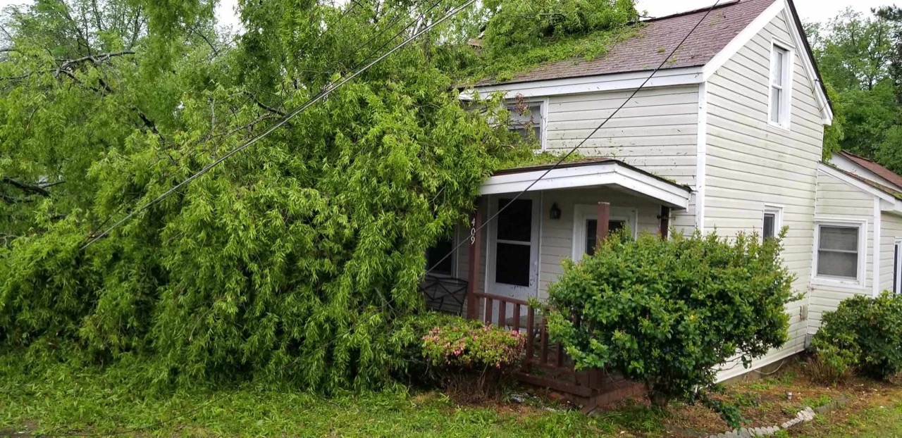 The storm came through around 6:45 this evening and knocked a tree into a house causing damage to the roof system and the corner.