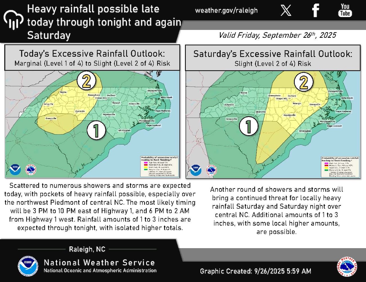 On Saturday, the slight risk of heavy rainfall covers all of central North Carolina.