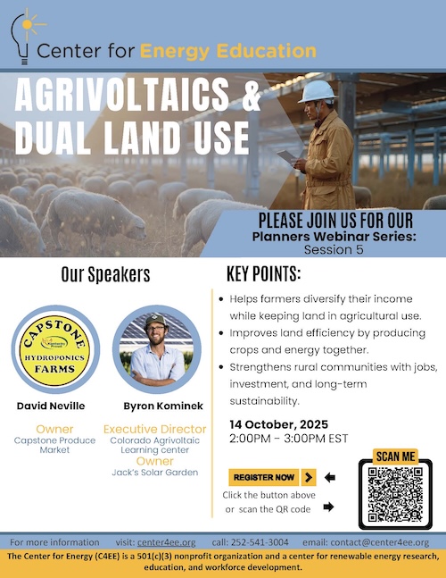 “Agrivoltaics and land management show how energy and agriculture collaborations illustrate community power,” said C4EE Executive Director Mozine Lowe. “Please join us to learn how these professionals are providing proof of the unlimited potential for maximizing economic value for farming on solar farms which ultimately will underscore the economic impacts of renewables as a rural industry.”