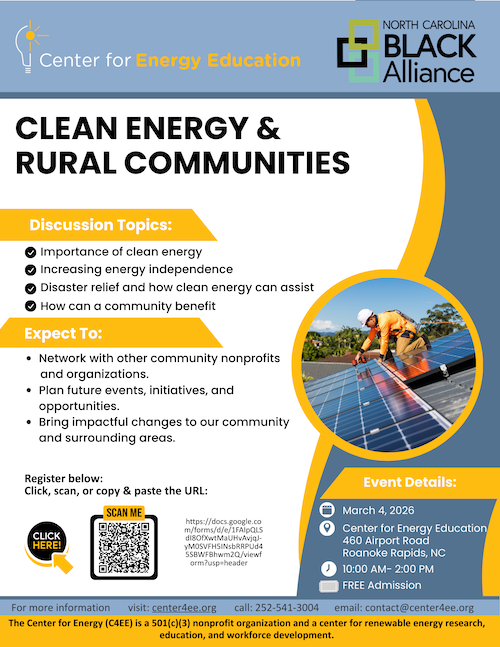 The Center for Energy Education and the North Carolina Black Alliance invite clean energy allies and community members to a rural clean energy convening on Wednesday from 10 a.m. to 2 p.m., at 460 Airport Road, Roanoke Rapids.
