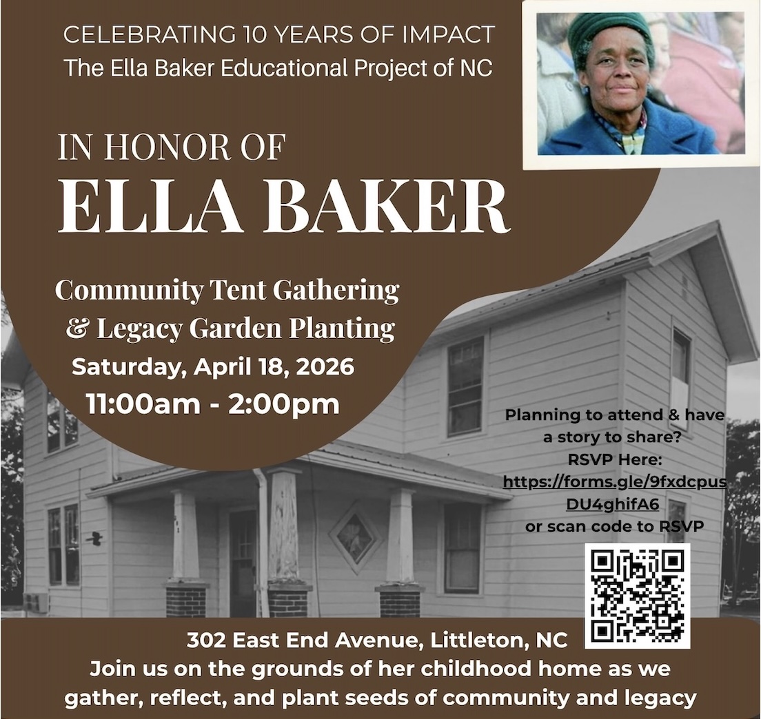 The Ella Baker Educational Project of North Carolina invites community members, neighbors, and descendants of Littleton’s historic East End community to a Community Tent Gathering and Legacy Garden Planting on Saturday, April 18 at 11 a.m. held at the childhood home of civil rights leader.
