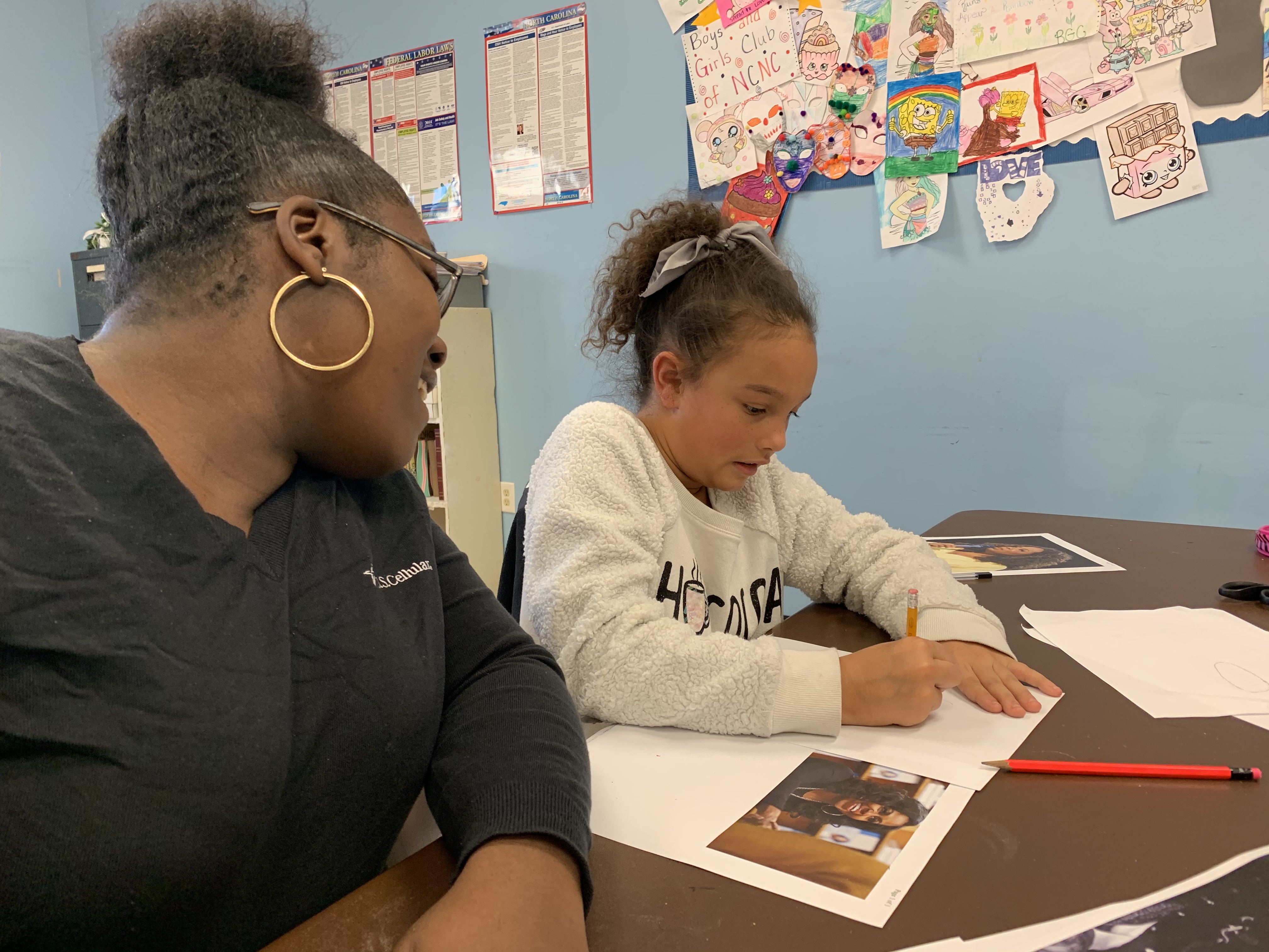 Photo 1: Adrianna Harvey, left,a member of Boys & Girls Clubs of North Central North Carolina Halifax Unit, works with Kristen Draughn, retail wireless consultant for U.S. Cellular in Roanoke Rapids, on her entry.