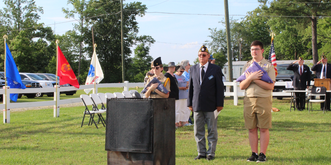 In the first gallery photo, from left: Sammons and First Vice Commander Jimmie Silver dispose of flags by burning. In the second gallery photo, from left: Clayton High School NJROTC Cadet Savannah Davis, Post 38 Sergeant At Arms Ted Hux and Boy Scouts of America Troop 144 Senior Patrol Leader Riley Garris.