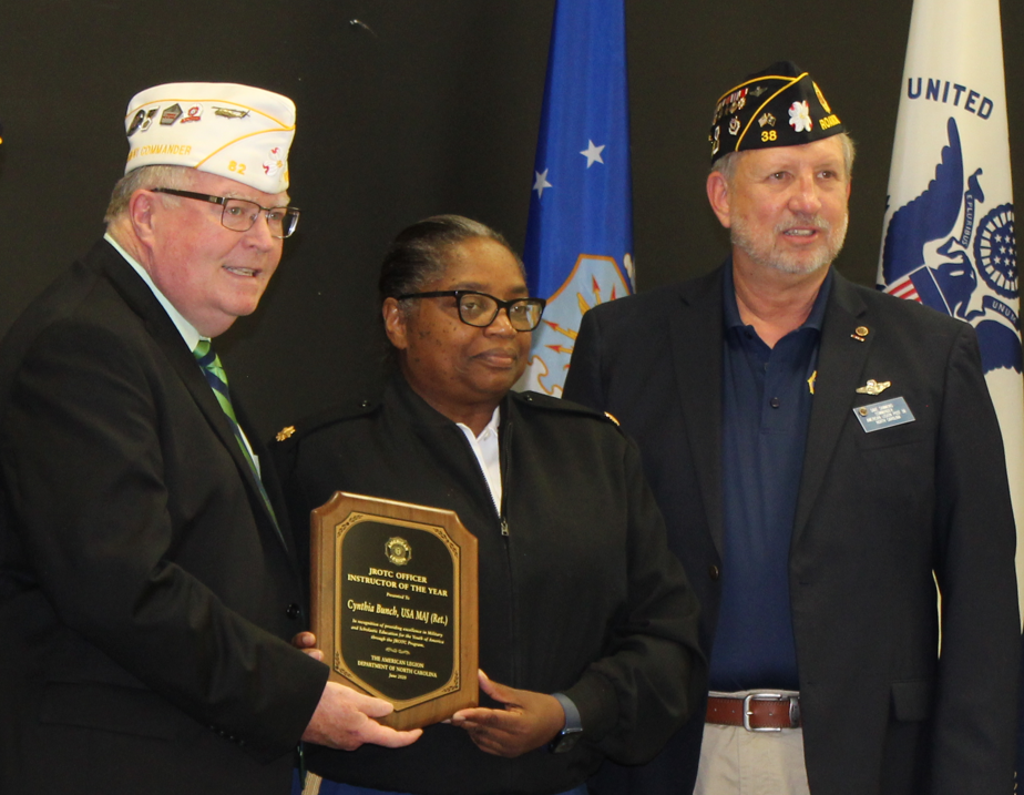 North Carolina American Legion Commander Jim Quinlan attended the Roanoke Rapids Shaw-May Post 38 meeting to present Roanoke Rapids High School Army JROTC Instructor Major Cynthia Bunch with the American Legion Department of North Carolina 2020 JROTC Officer Instructor of the Year Award.