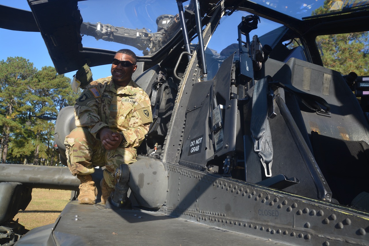James Bond deftly piloted the Apache helicopter over the campus of Halifax Community College this morning, the mighty rotors creating a whirlwind of leaves and dust as the iconic aircraft touched down in the center of the school’s fitness trail.