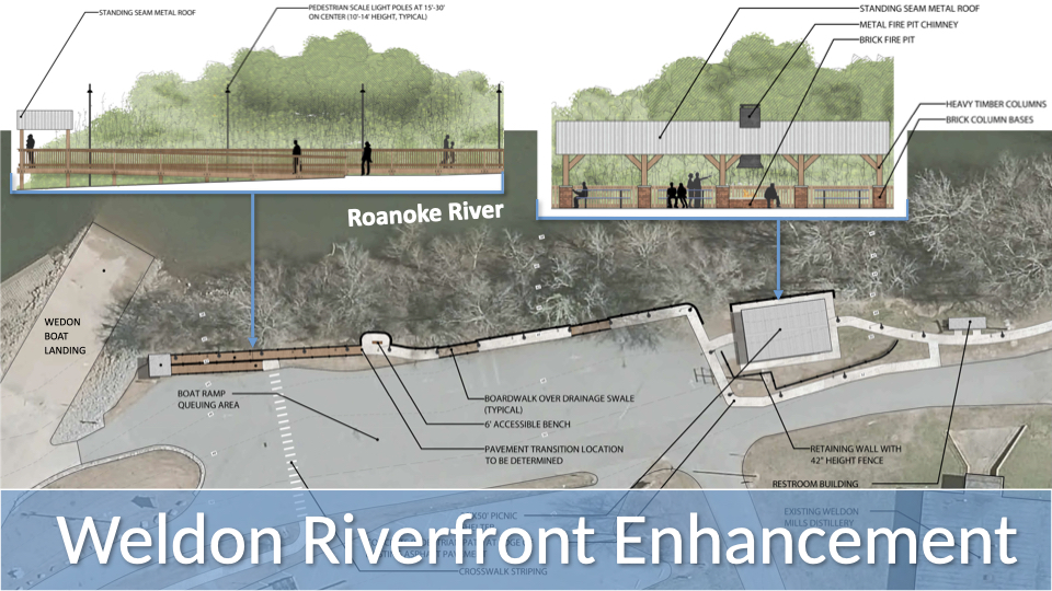 It will include pavilions at the end of each project for community programming, concerts and special events. The pavilions consist of picnic facilities and trash receptacles. “These enhancements will allow handicap accessibility to the Roanoke River vistas and encourage recreation along Weldon’s riverfront.”