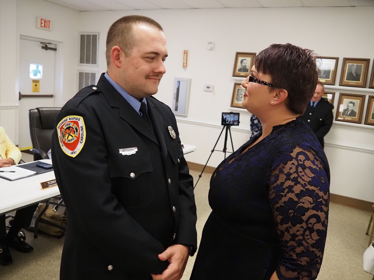 The Roanoke Rapids Fire Department announced three new hires and three promotions during Tuesday’s city council meeting and presented their badges to the six firefighters.