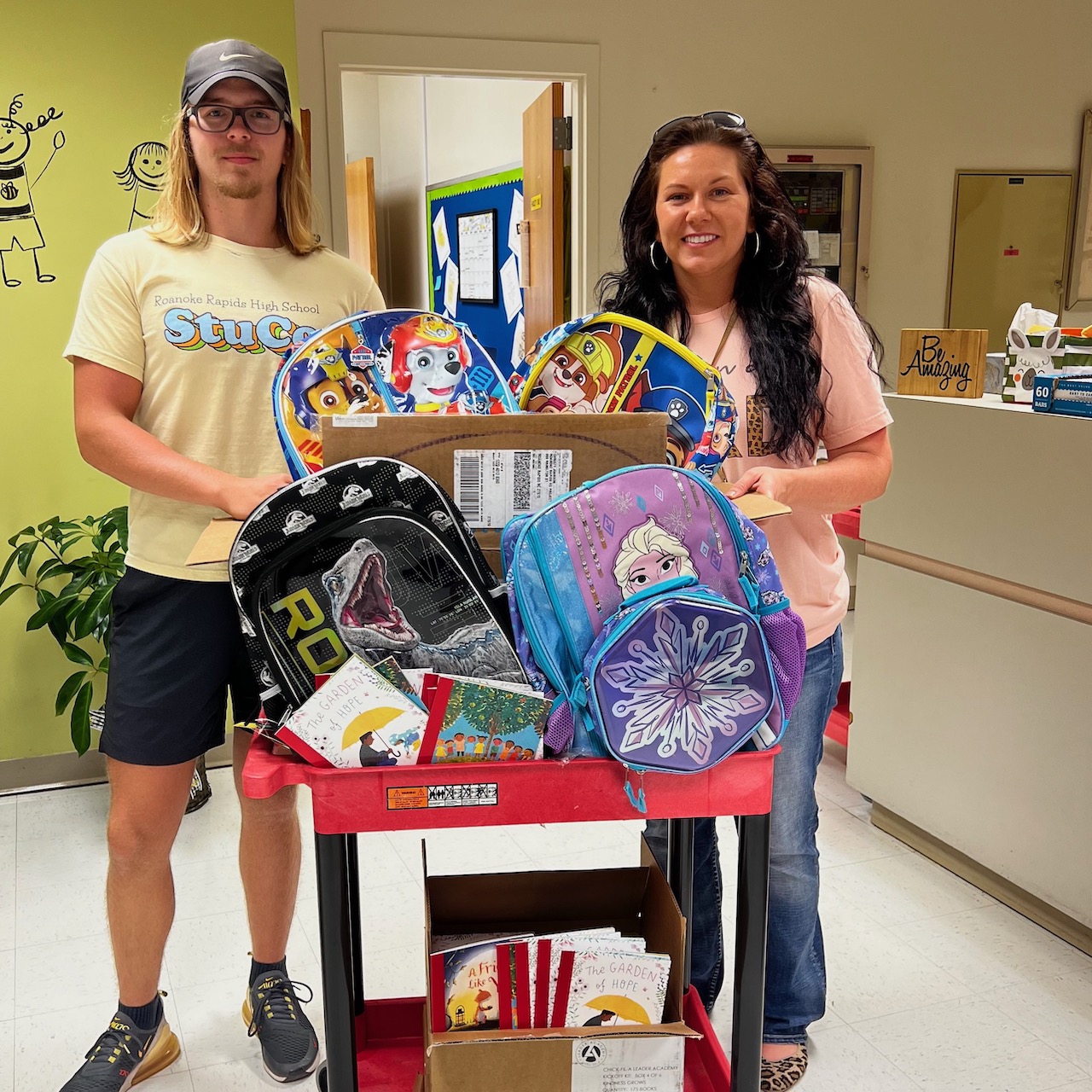 Elementary students in the Roanoke Rapids Graded School District received book bags from the high school’s senior class as well as four boxes of children's books.