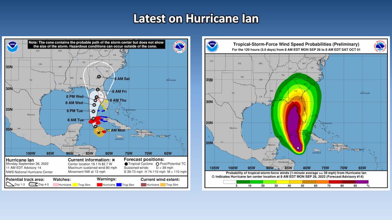 In its afternoon briefing the NWS said Ian is currently a Category 1 storm with sustained winds of 75 miles per hour.