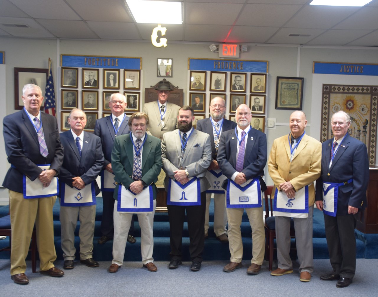The officers, pictured from left are: Front row, pictured are as follows: WB Neal Davis - Tyler; Dennis Gantt - Junior Deacon; Fred Grooms - Junior Warden; Matthew Council - Senior Warden; Jamie Taylor - Chaplain; Walter Brooks - Steward; WB Tom Wadkins - Stewart; Second row: Dennis Sparks - Senior Deacon; 2023 Master Elect WB Albert Etheridge; WB Danny Rose - Treasurer