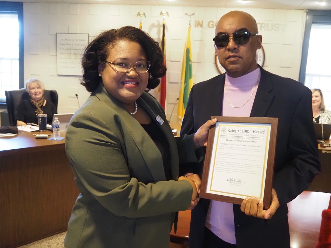 Halifax County commissioners Monday honored a longtime Roanoke Rapids businessman and veteran who in November had been recognized in the Congressional Record for his service.