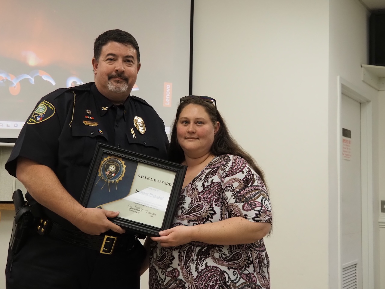 Heather Pleasant, an administrative assistant assigned to the police department’s patrol division, was presented the SHIELD Award by Chief Shane Guyant during city council’s Tuesday meeting.