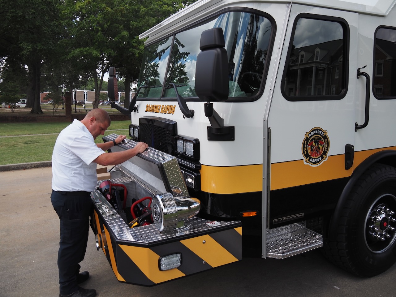 Roanoke Rapids A Shift firefighters watched Thursday morning as the president of Fire Connections backed the department’s new pumper into Station 1 on Roanoke Avenue.