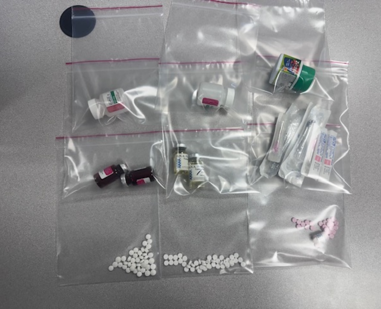 During the search of the vehicle, 115 schedule III pills — methandrostenolone/testosterone and cypionate/propionate — 700 milligrams of liquid schedule III — testosterone cypionate — and syringes were located.