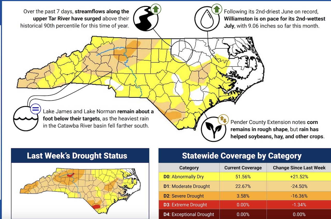 “Widespread, heavy rainfall has resulted in a one-category improvement across most of the state,” said Klaus Albertin, chair of the DMAC. “While the deficits from June and early July have not been completely erased, conditions have improved significantly. The rains from this week should result in continued improvement.”
