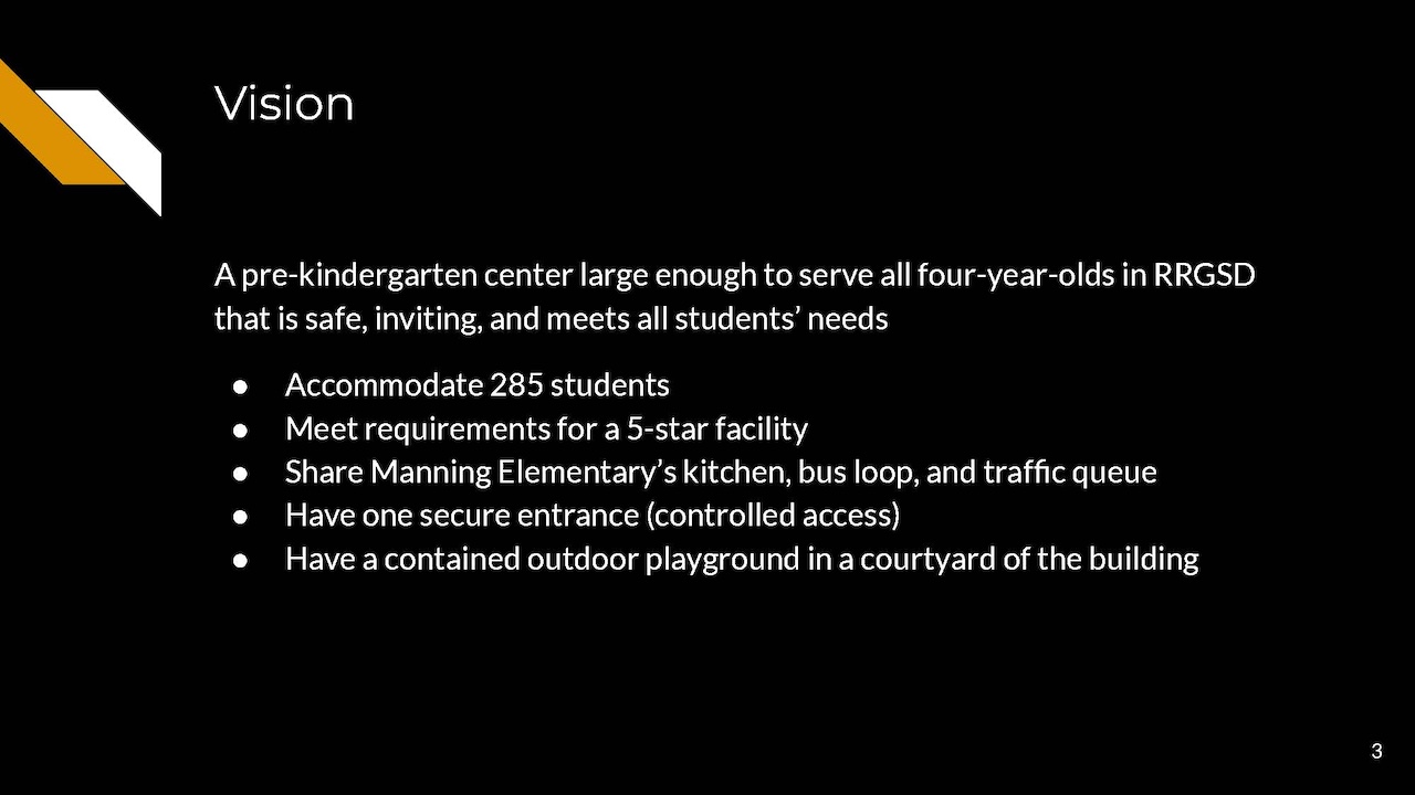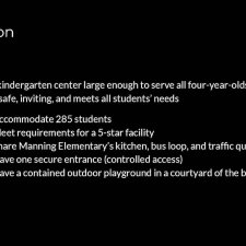 The building would accommodate 285 students and meet requirements for a five-star facility. It would share Manning’s kitchen and have one secure entrance, as well as a contained outdoor playground.