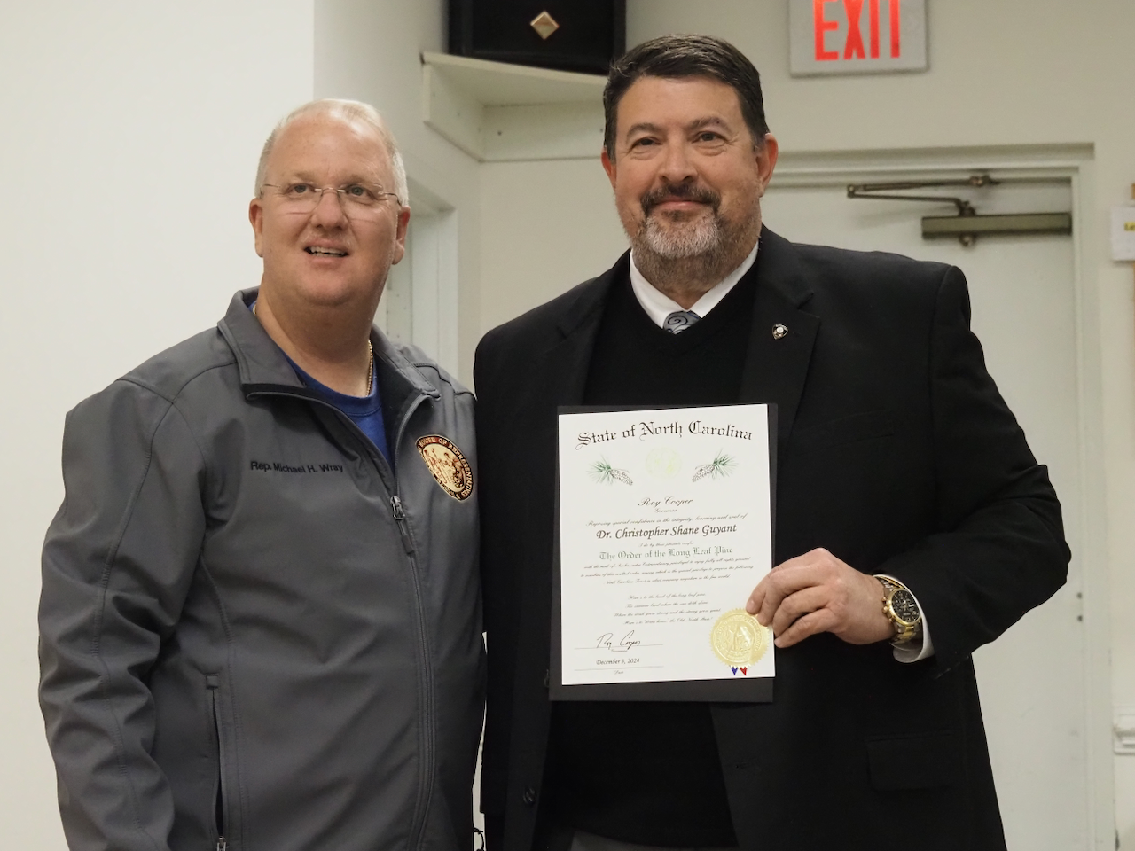 Wray said, “The state of North Carolina, Roy Cooper reposed in special confidence, integrity, learning and zeal do present Dr. Christopher Shane Guyant and confer the Order of the Long Leaf Pine with the rank of ambassador extraordinaire.”